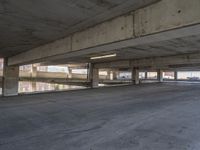 A sunny view of a modern city with clear blue sky and sleek urban architecture. The concrete cityscape is adorned with parking decks, while the asphalt roads lead to towering office buildings. A perfect representation of city life.