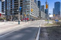 This stock photo features a modern cityscape in Toronto, Ontario, Canada. The photograph showcases the beautiful architecture and infrastructure in the city. The image includes a wide asphalt road with a clear sky overhead. Tall skyscrapers can be seen along the road, creating an impressive urban design. The photo was taken during the day, capturing the vibrant city life. Trees lining the streets add a touch of autumn, with their colorful leaves. The road surface is in excellent condition, perfect for various modes of transport. A zebra crossing and street lights indicate a well-designed and safe street. The image also includes some vegetation, giving a sense of greenery in the urban environment. This stock photo perfectly represents the dynamic and modern city of Toronto.