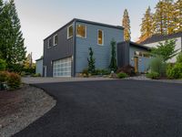 A modern residential building in California, surrounded by lush vegetation and clear skies. The concrete driveway leads to the entry of the house, making it a perfect property to call home.