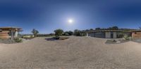 A modern house with a fish eye lens effect, situated on a hill with trees on either side. The surrounding lawn adds to the picturesque landscape. A perfect blend of nature and modern architecture in Los Angeles, California.