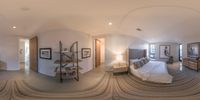 a room with a bed and shelves on both sides of it with mirrors above the bed