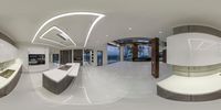 A modern kitchen with large windows in the ceiling, providing a full view of the clear sky. The white marble counters and contemporary cabinetry create a sleek and stylish design. Perfect for a vacation villa or urban home.