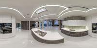Modern kitchen with white countertops and cabinetry. The fish-eye view captures the sleek design and elevated surfaces. Clear blue sky is visible through the window. Perfect for urban living or a vacation villa.