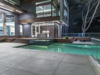 This stunning image showcases a modern architectural masterpiece in Los Angeles, California. The building is beautifully lit up at night, highlighting its sleek design and contemporary features. With its pristine glass surfaces, this home exudes luxury and elegance. Located in a desirable residential area, this property offers a perfect blend of nature and sophistication. The spacious interior design boasts an open floor plan, with flooring made of exquisite tiles. The floor-to-ceiling windows flood the room with natural light, creating a bright and inviting atmosphere. The villa also features a magnificent swimming pool, surrounded by a concrete surface and adorned with artificial light for a captivating aesthetic. This recreational area is perfect for outdoor gatherings and relaxation. Discover the ultimate modern living experience in this stunning Los Angeles property.