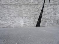 an empty parking lot next to a cement structure with a black door opening into it