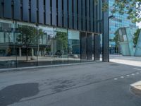 A modern office building in Barcelona's business district casts a hard shadow on the smooth asphalt surface below. The city's urban design and architecture blend seamlessly with the vibrant city life. A perfect representation of Barcelona's urban charm.