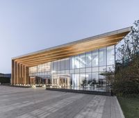 A large, modern office building with a wooden structure stands tall in China's urban landscape at twilight. The blue sky creates a stunning backdrop, highlighting the sleek glass facade and open courtyard within. A true architectural masterpiece in the heart of Chongqing.
