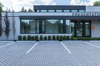 This stock photo features the front entrance of a large office building located in Toronto, Canada. The modern architecture of the building is highlighted with a sleek and contemporary design. The building is surrounded by a spacious parking lot, providing ample space for visitors and employees. The office sign on the facade indicates the presence of various businesses inside. The image captures the building during the day, with natural light illuminating the surroundings. The straight road in front of the building leads the viewer's gaze towards the entrance. The infrastructure, including the asphalt road surface, is well-maintained. The city's vibrant urban design is reflected in the profile of the office building, showcasing its significance in the bustling business district. The surrounding vegetation adds a touch of greenery and shade to the public space. This photo is ideal for illustrating concepts related to architecture, modern buildings, business, and urban design in Toronto, Canada.