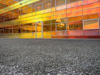 This is an image of a modern office building in the business district of Holland, Netherlands. The open space in front of the building provides a clear view of the architecture and its multicolored facade. The building features a rectangle shape with composite materials, glass, and wood. The road surface leading to the building is made of asphalt and gravel, and it contrasts with the orange tints and shades of the building. This photo represents a typical day in the business district of Holland, showcasing the modern architecture and vibrant atmosphere.