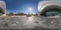 a fish - eye view of a building with two circular windows and a blue sky in the background