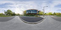 Modern office building in a Toronto residential neighborhood. The fish eye view captures the unique architecture against a backdrop of grey sky. The surrounding area features open spaces, tree-lined walkways, and a mix of residential and business properties.