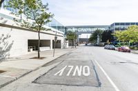 An empty street in the business district of Milwaukee, Wisconsin. Modern office buildings and residential properties line the road. The cloudy day adds a sense of calm to this bustling urban neighborhood.