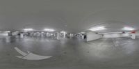 An empty parking lot in Los Angeles, California, captured through a fish-eye lens. The concrete surface and artificial lighting create an urban atmosphere. The design of the parking deck showcases modern architecture and interior design.