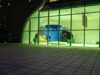 a building with some large windows at night time and plants in the window boxes in front