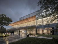 a building with glass windows and trees in front of it at night time with rain falling off