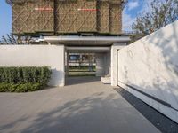 A modern residential building with a sandstone wall facade stands majestically in an urban area. The straight concrete pathway leads up to the entrance, surrounded by lush vegetation and trees.