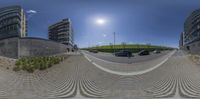 A panoramic view of a modern urban neighborhood in Bremen, Germany. The clear sky reflects off the sleek architecture of residential buildings and office spaces. Cars parked along the driveway create a vibrant city scene.