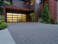 A stunning modern residential home with a large driveway made of black brick pavers. The driveway is illuminated by lights, creating a warm and inviting ambiance. The surrounding grass and trees add a touch of natural beauty to the property. This well-designed house features sleek architecture with rectangular lines and composite material. The entrance door provides access to a lovely interior with stylish flooring. The property is located in a peaceful neighborhood, offering a tranquil living environment.