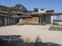 This photo features the entrance to a modern residential home located in Los Angeles, California, USA. The home is characterized by its wooden siding, concrete facade, and gravel parking lot. The property is surrounded by open space, with trees and vegetation adding to the natural landscape. The clear sky and ample shade create a serene and inviting atmosphere. The home is situated in a suburban area, providing a peaceful and tranquil living environment. This image captures the essence of modern architecture and real estate in Los Angeles.