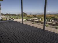 A modern residential home in Los Angeles, California with a spacious deck and open courtyard. The house features a beautiful wood floor and a sleek design. Surrounded by lush green grass and trees, the property offers a peaceful suburban retreat.