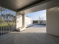 A modern residential villa in the city at dawn. The concrete facade blends with the surrounding urban design. The clear sky casts a beautiful shade on the sandstone walls. City life at its finest.