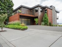 A modern residential villa with sleek architecture and large windows, set against a gloomy grey sky. The house is surrounded by vegetation and trees, creating a tranquil and shady land lot. The asphalt road surface leads to the entrance of the villa.
