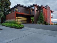 A modern residential villa surrounded by trees and vegetation. The gloomy grey sky at dawn adds a touch of mystery to the urban design. The surface of the road and land lot enhances the modern architecture.
