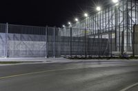 the tall gate is behind an empty parking lot at night time at the edge of a street