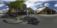 a city intersection with many buildings and trees around it in a 360 - ray lens