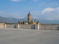 A modern urban landscape in Salt Lake City, Utah. The city's architecture and urban design are showcased by the concrete streets and parking garages. The clear sky adds to the modern feel.