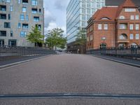 an empty street is shown with some buildings in the background while the pedestrian bridge leads down