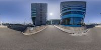 A modern urban landscape in the heart of Holland's business district. The curve of the road leads to an open space with two office buildings standing on top of a bridge. Straight down the road, a bus stop blends seamlessly into the city's design.
