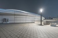 A modern urban plaza at night, illuminated by artificial lights. The futuristic architecture of the museum and opera hall creates a striking contrast against the dark sky. Open spaces and pavers enhance the overall aesthetic.