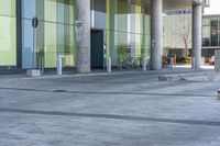 an empty plaza with benches and steps leading into a building with columns, green walls, and a bike parked in the background