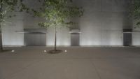 two tree growing in an empty courtyard at night with benches on either side and concrete wall