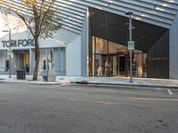 This stock photo showcases the entrance of a store that is located on the sidewalk in Miami Beach, Florida. The modern architecture and urban design of the storefronts blend beautifully with the city's vibrant atmosphere. The scene captures a typical day in Miami, USA, where city life thrives amidst the bustling roads and shops. The store stands out against the backdrop of the tree-lined sidewalk and the asphalt road, offering a glimpse into the urban lifestyle of Miami Beach residents and visitors.
