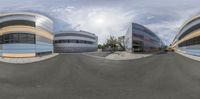 A modern urban warehouse in Europe, Germany with multicolored architecture. Daylight casts hard shadows on the industrial manufacturing complex. Elevated view captures the vast storage depot and asphalt road below.