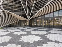 a walkway that has white geometric tiles on it in front of buildings with glass walls