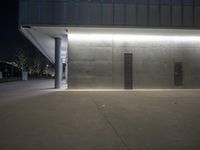 A modern walkway in Shanghai, China, illuminated by artificial light at midnight. The concrete walls and black metal doors create a sleek urban design. This is the epitome of city life in the business district.