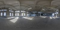 An industrial warehouse with a modern architectural design. The glass façade reflects the surrounding open space, while the sunlight creates a play of shadows and highlights. Inside, people gather in the spacious hall, creating an urban art district vibe.