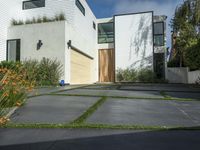 This image showcases the front of a two-story white house situated in the suburbs of Los Angeles. The house features a contemporary architecture design and is surrounded by a neatly paved sidewalk. Two cars are parked on the side, adding to the charm of the residential neighborhood. The driveway leads up to the entrance of the house, while a straight road stretches out into the distance. The blue sky with clouds in the background enhances the overall appeal. Perfect for real estate or architectural design concepts.