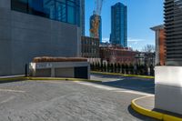 This is an image of a modern urban architecture in a Canadian city. The cityscape features tall buildings with sleek and modern designs. Shadows are cast on the road and driveways, creating a dramatic effect. The clear sky with scattered clouds adds a beautiful backdrop to the scene. This photo captures the essence of urban living in Canada, with its bustling city life and impressive architecture. Whether it's Montreal or Toronto, this image represents the vibrant and dynamic atmosphere of a Canadian city.