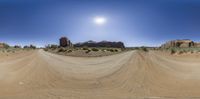 a 360 - view image with sand and rocks in the background, and sun behind them