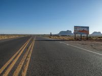 An asphalt road leading through Monument Valley in Utah, under a clear sky at dawn. A sign symbolizing the break of day in the American landscape. Nature's beauty captured in the USA.