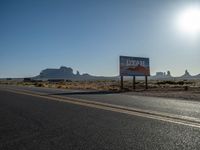An asphalt road in Monument Valley, Utah, under the clear morning sun visible at dawn. Monument Valley's iconic landscape with distinctive road signs. Nature bathed in the warm sunshine of the USA.