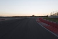 The lights on a race track create a beautiful motion blur effect as the sun sets. The asphalt road stretches ahead, leading straight into the horizon. The vibrant red of the race cars zooming by adds excitement to the scene. The clear sky overhead provides a perfect backdrop for this thrilling racing event.