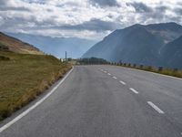 Motorcycle driving along a curvy countryside road in front of mountain range