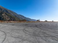 a motorcycle parked on a mountain road next to hills and a hill side road with tire tracks in the concrete