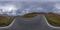 a motorcycle driving down a curve in the road as seen in the mirror of a fish eye view