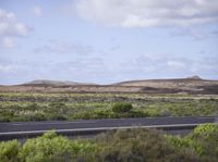 A man riding his motorcycle on an asphalt road in the wilderness of Fuerteventura, Spain. The road cuts through highlands, hills, and plains, surrounded by lush green grass and the clear blue sky. Experience the natural beauty of Europe's island paradise.